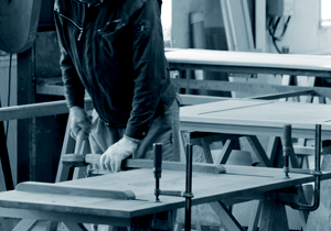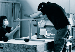 製品を構成する部材同士を水平、垂直レベルの微調整を行いながら接着剤を用いて一品ずつ丁寧に、素早く組み上げます。