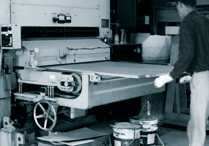 巨大なロール状の紙やすりが高速回転する機械を通すことで、厚みを0.1mm単位で調整すると同時に粗い研磨を行います。