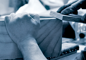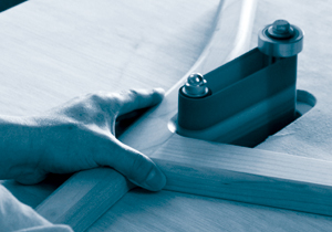 木材の欠点や色合いを見極めながら製品に使用する各部材をカットします。材料を読む(予測する)長年の経験が求められます。