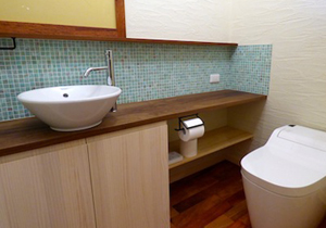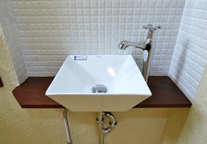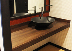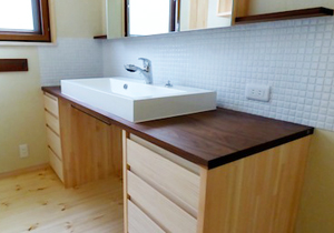 洗面カウンター、手洗いカウンター、リビングの壁面カウンター、書斎コーナーのカウンター、対面キッチン型カウンターの他、階段踏み板、階段笠木、玄関上框等の実例があります。