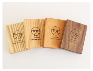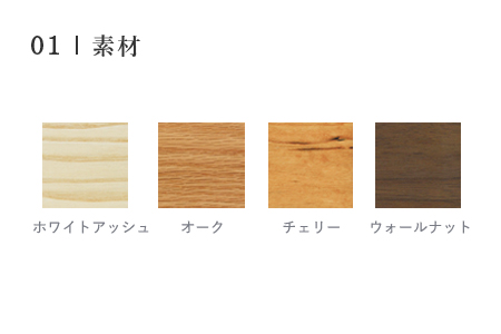 インテリアや顧客の嗜好にあわせて4つの素材(ホワイトアッシュ/オーク/チェリー/ウォールナット)を選べます。