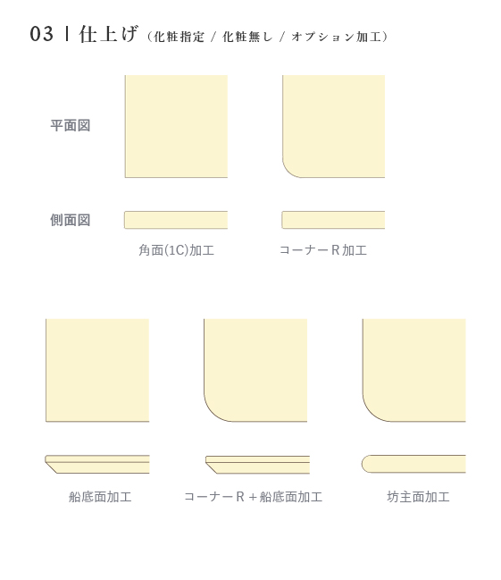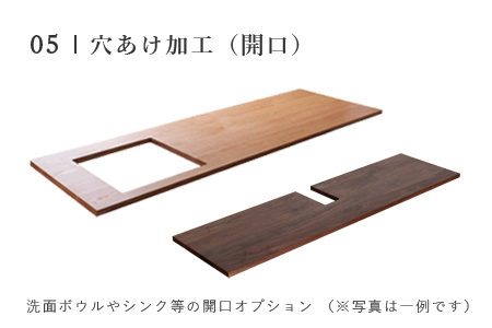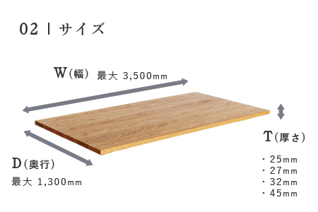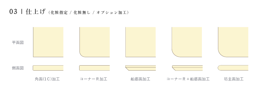 厚みも25~45mmまで対応可能。化粧面のご指定や天板端部の加工(丸面/船底/R加工etc)も承ります。