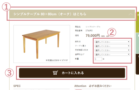 ご希望の素材、サイズの商品名のタブをクリックしてメニューを開いたら、ご希望のテーブル高さ、塗装等を選び、「カートへ入れる」ボタンをクリックします。