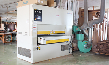 ワークサイズは最大1300mm幅まで可能で大きな天板や量産ロットのパーツ研磨で圧倒的な生産性を誇る。大きな電気容量が求められ、山陰地区の木工業界では導入の少ない機械の一つ。