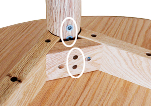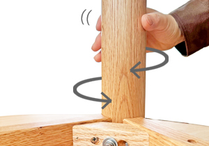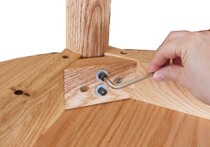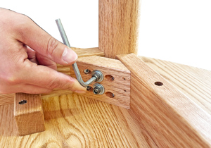 天板側(隅木)の穴と脚側(鬼目ナット)の穴の位置を合わせ、ボルトを通します。(※下の穴を先に合わせると通しやすくなります。)