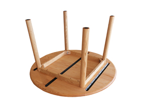 ラウンドテーブルType Bは、天板裏の幕板(脚と脚をつなぐ補強材)と四方転びの円柱脚で、デザイン性と安定感を両立させています。
