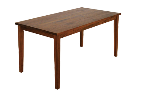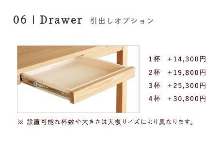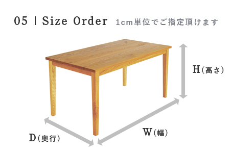 1cm単位のサイズオーダーと豊富なオプション設定に対応する、シンプルな定番ダイニングテーブル。幕板を設ける耐久性の高い設計で、大型サイズも製作が可能です。